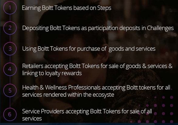 Boltt tworzy platformę gazowania dla zdrowia społecznego i wszystkich otaczających ekosystemów, które mają motywować ludzi do utrzymania aktywności fizycznej w wyjątkowy sposób: Boltt nagradza BoltCoins za działanie i osiąganie celów zdrowotnych; Boltt wprowadza interfejs społecznościowy, grę, która sprawia, że aktywność fizyczna jest przyjemna i ekscytująca dla użytkowników. To motywuje ludzi i promuje zmiany w zachowaniu przez całe życie, aby osiągnąć swoje cele zdrowotne i sprawnościowe. Ponadto taryfy i aspekty społeczne wykorzystują życzenia osób związanych ze statusem i korzyściami.